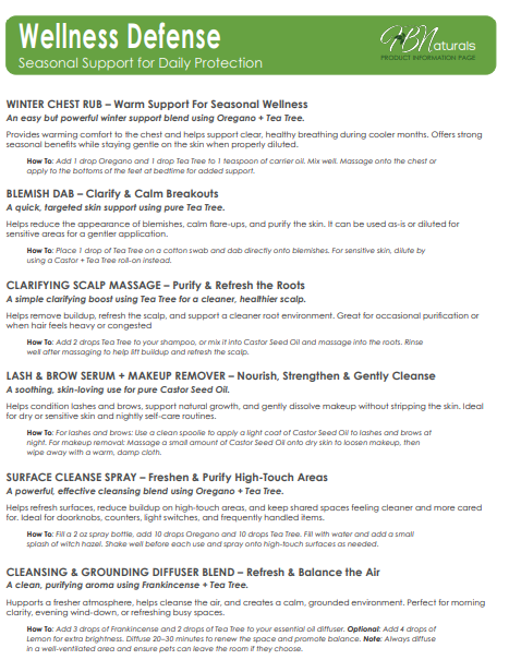 When the season shifts and the air cools, your body asks for a little extra support. Something clean. Something simple. Something that works. The Wellness Defense Kit brings together four of nature's most trusted oils and gives you three roll-on bottles so you can make your own daily wellness blends in minutes. Whether you're supporting your skin, strengthening seasonal defenses, freshening your home, or caring for your family, this kit is your all-in-one winter companion.*